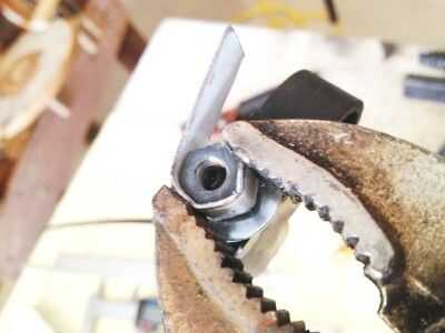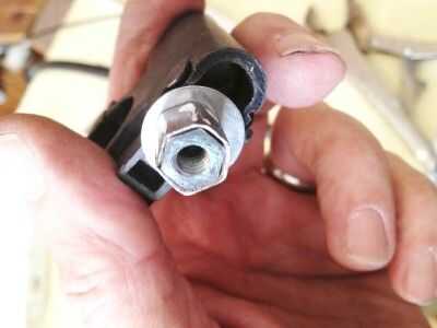 En el paso 1, la foto muestra que la tuerca de acoplamiento entre con mucha soltura en la hexagonal en la perilla. Usé un calibrador para determinar cómo gruesas una pieza de acero debe ser alrededor de la tuerca de acoplamiento y llenar el vacío. Usé un tornillo de banco alicates para ayudar en el acero de flexión para adaptarse. Incluso en eso, el ajuste de una operación de ese tipo rara vez es perfecta. Como se puede ver en la segunda foto lo hice un poco de luz pulido alrededor de la cuña de metal para un mejor ajuste.
