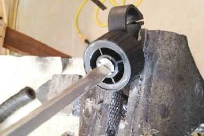 Perforado el agujero en la parte superior de la perilla de ajuste de un tornillo de 1/4 de pulgada. El calce de metal alrededor de la tuerca de acoplamiento no encaja perfectamente, pero era capaz de empujar la perilla en la misma parte de la forma a mano. Usé el tornillo para sacar la perilla en la tuerca de acoplamiento el resto del camino. Ver la segunda foto. Usé un esmeril para quitar el exceso de la cabeza del tornillo y hacerlo al ras de la placa que va en la parte superior de la perilla de montaje. Tuve cuidado de no moler lejos cualquiera de plástico. Cuando así, lo dejó con frecuencia y deje enfriar el tornillo, el tornillo calienta bastante.