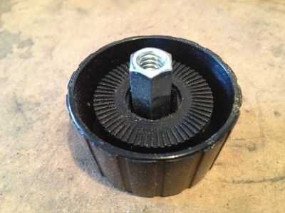 decidí usar un acoplador tuerca (ver foto), pero ¿de qué tamaño? Medidas de la hexagonal en la perilla de ajuste 7/16 de pulgada y una tuerca de acoplamiento para roscas de 5/16 de pulgada encaja exactamente la hexagonal, pero varilla roscada de 1/4 de pulgada va a funcionar mejor para algunas otras consideraciones.