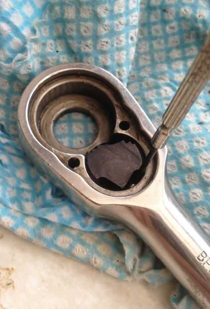 Presione el rodamiento de bolitas en el resorte con un destornillador delgado hasta que quede al ras con la carcasa y manténgalo en su lugar. Ranura en el engranaje de avance/retroceso con los dientes hacia arriba y vuelta ligeramente a un lado así que las ranuras de la hendidura izquierda o derecha el destornillador. Gire el interruptor en la parte posterior hasta que la ranura de dos clavijas en los agujeros en la parte trasera del engranaje de avance/retroceso.