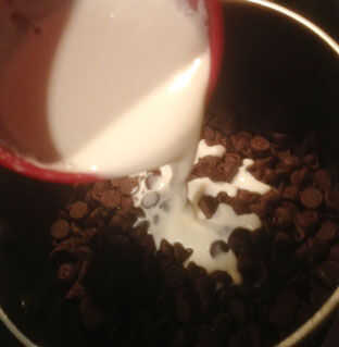 1. derretir los chips de chocolate y mezclar en 1/2 de la crema a fuego lento, revolviendo cada 30 segundos hasta que esté suave. Enfriar a temperatura ambiente. Agregue el azúcar y la vainilla. Ponga a un lado.