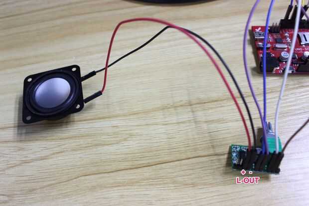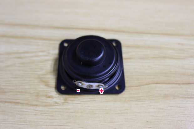 Al final, tenemos que añadir una "voz" agradable a él para que pueda emitió una voz maravillosa. ¡ sí! Elegimos un mini altavoz de 40mm para desempeñar este papel, tenemos que soldar con autógena el alambre puente al altavoz, el rojo se conecta con el "+", el negro se conecta con el "-". Este altavoz se debe conectar con amplificador de audio, elegimos el L-OUT como salida de audio esta vez, según la conexión como se muestra.
