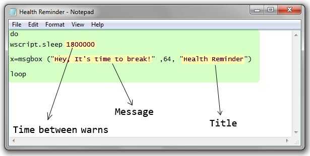 Línea 3: Después de eso, mostrar un cuadro de mensaje con "Hey, es hora de romper!" contenido y el título de "Recordatorio de la salud". 64 es el tipo de cuadro de mensaje. Para obtener más información acerca de tipos de mensaje, echa un vistazo aquí.)