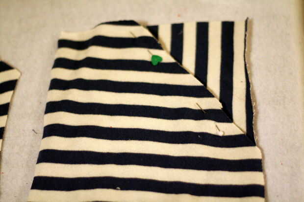 Tomar la pieza delantera del pantalón y poner al revés en la parte superior del lado equivocado de su bolsillo, alineando sus bordes inclinados. Yo sé que suena complicado, pero solo pone sus bragas (lado derecho hacia arriba) en el bolsillo y pin su borde slanty juntos. Luego, coser este slanty que se están reuniendo su bolsillo y la delantera del pantalón. Mueva la pieza posterior del bolsillo fuera del camino para que se no pesca en la costura, coser. Repita con el otro bolsillo.