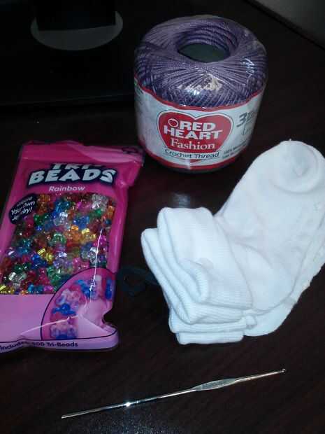 1 par de niñas calcetines, (utilicé 3-5 años de edad) crochet hilo, tri-bolas de plástico, gancho de ganchillo pequeño (usé tamaño 3 / 2.10 MM) y 4 pernos de seguridad.