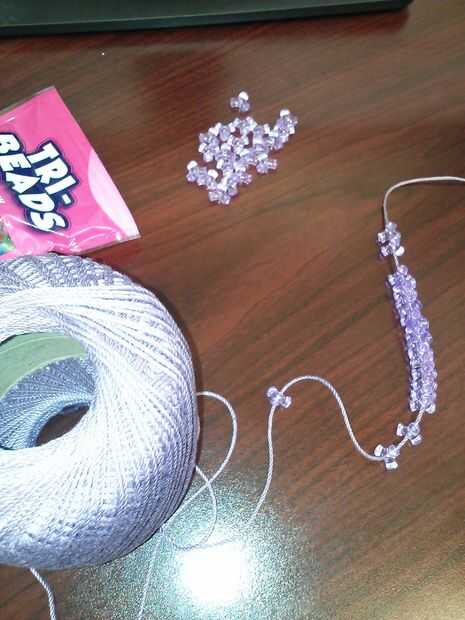 Cadena 20 tri-abalorios en el hilo de ganchillo. Esto es para 1 calcetín, se necesita otro 20 granos por el otro calcetín.