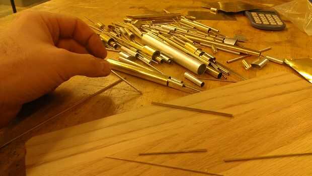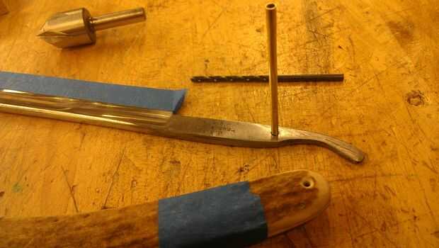 Para seleccionar la broca de tamaño adecuada poco que pruebo que encajen en el agujero del pivote en la hoja. Una vez he seleccionado la mejor guarnición poco que empiezo a mirar para la barra de latón o tubo que así se ajuste a ese agujero para los pasos finales. Con este bit seleccionada usar un taladro para perforar primero la mitad marcada. Entonces la coincidencia de la mitad a la mitad perforada de cinta y completar los pasos para que los agujeros son concéntricos.