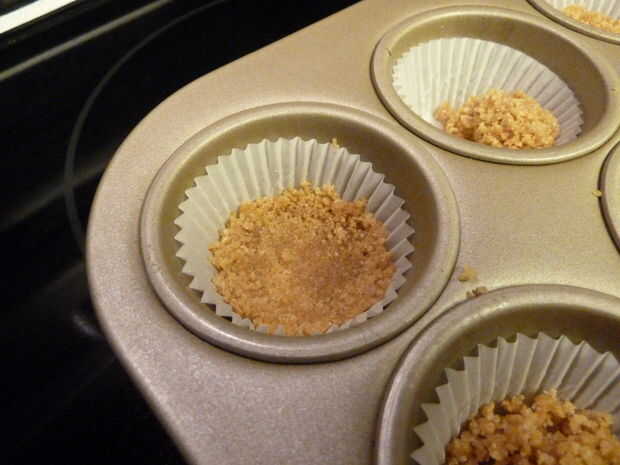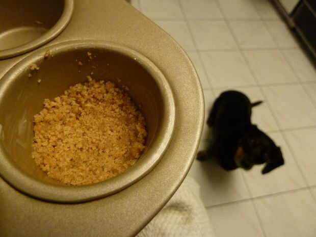Una vez mezclado, colocar 1 cucharadita de mezcla de corteza de amontonamiento en la bandeja de lata mini. Puede utilizar trazadores de líneas, o un recipiente rociado. Presione la corteza en el pan para que su bonito y compacto.