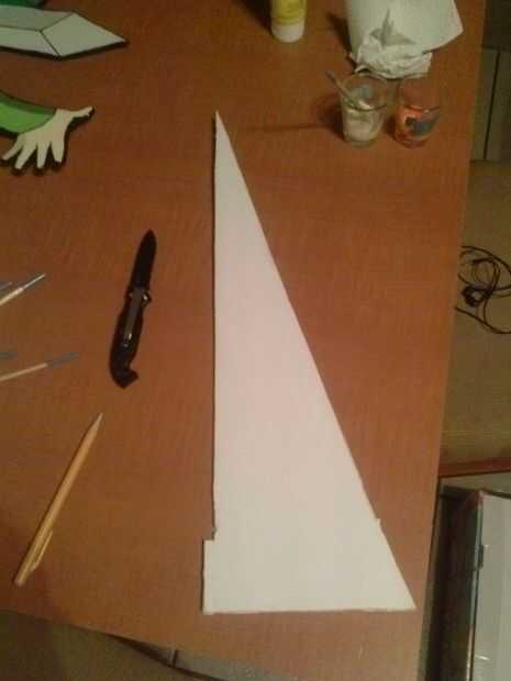 Retire su sección triangular de su pieza más grande de cartón pluma. Aplique adhesivo en los bordes de la pieza triangular que va a tocar la parte posterior de la pieza pintada. Deslice el quid de la pieza triangular en el corte en la parte inferior de la pieza pintada y presionan juntos firmemente para permitir que el adhesivo se seque.