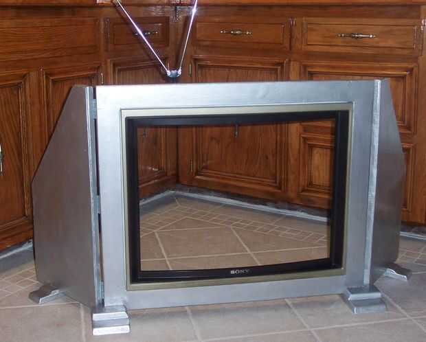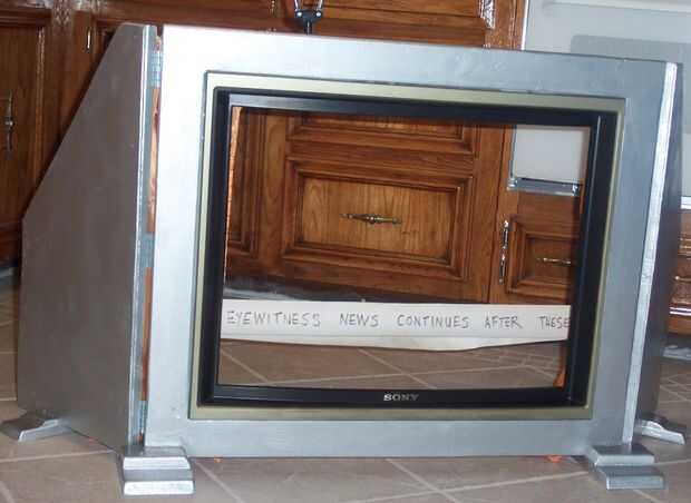 El bisel es de 27" piso de madera consola TV que tenía que ir bye-bye. Realmente había destripado a las entrañas de la TV y guardado el gabinete de la consola para hacer un escritorio de la computadora conectando un cajón de teclado donde el tubo use para ser. Renovado los altavoces estéreo para conectar equipo gran sonido. No hacen ya TV en muebles y armarios de madera de todo eso bueno fue una pena perder.