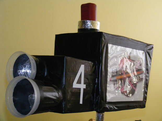 Revisa los apoyos adicionales de TV que hice para una obra escolar. Nada más que cajas de cartón, botellas de agua vacías, envases de comida para llevar, todo cubiertos con papel de forro de plástico, cinta aislante y cinta de sellado de conducto de aluminio.