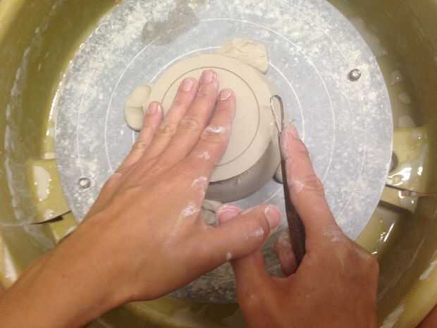 • Mano izquierda debe descansar suavemente en el centro de la arcilla. Manos son conectados de alguna manera-pulgar, pulgar, pulgar derecho la izquierda dedo del índice, dedo índice/index, etc.. Esto permitirá un mayor control al comenzar a cortar.