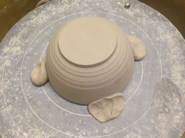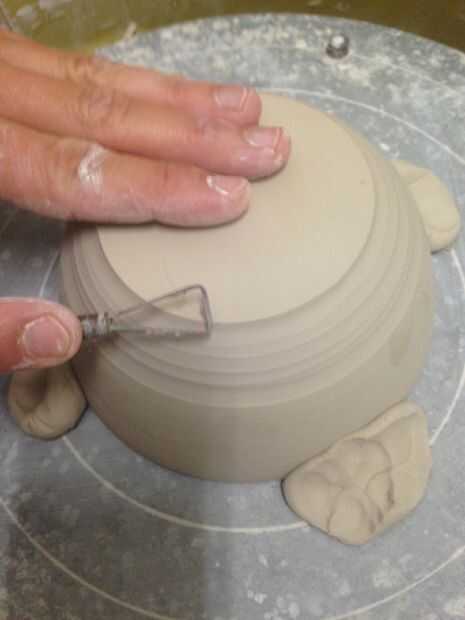 • Aplicar en la esquina derecha del lado cuadrado de la herramienta hacia abajo en el bote. Una vez que se ha formado una cresta hasta meta esa a la derecha y hacia el centro de la maceta para cortar el borde del pie.