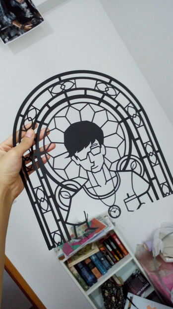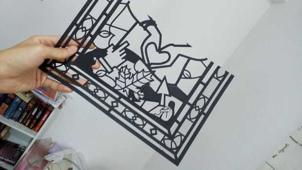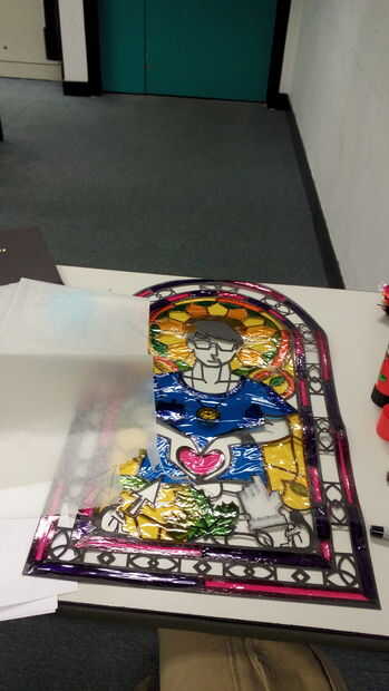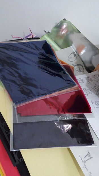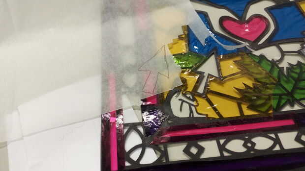 lo hice por películas superpuestas del mismo color, así como diverso color hasta 4 capas! Tienes una amplia gama de rojos y amarillos. He probado la forma de dibujo antes de cortar la película de color, era precisa pero extremadamente lento. Entonces pegué un pedazo grande de película de plástico sobre el patrón, luego recortar el exceso.