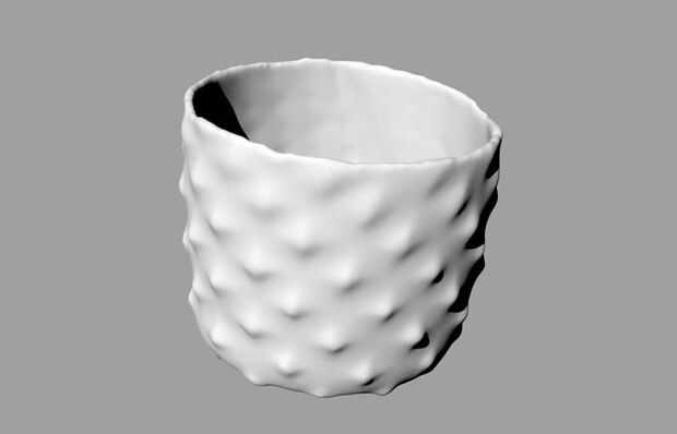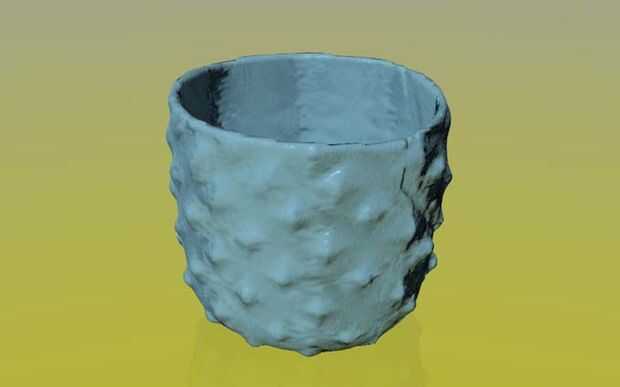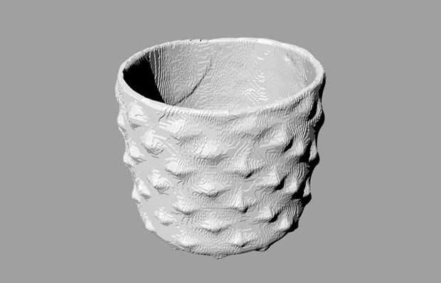 El siguiente paso fue añadir las rodajas como se muestra en la primera imagen. La adición de las rebanadas dio lugar a algunas lagunas que deben rellenarse utilizando software de reparación de la malla. Esto dio lugar a un áspero se muestra en la segunda imagen del archivo STL. Esta taza muestra claramente las capas de la exploración. Un compromiso necesario entre alisando hacia fuera de la visibilidad de capa y manteniendo los detalles interesantes de la Copa. El resultado final se muestra en la última imagen.