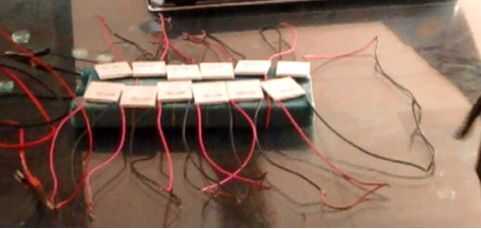 Ahora coloque los azulejos peltier en el paquete del Gel. Conectarlos con cables en serie. Los azulejos peltier deben colocarse en disposición que cubre toda el área del paquete del gel.