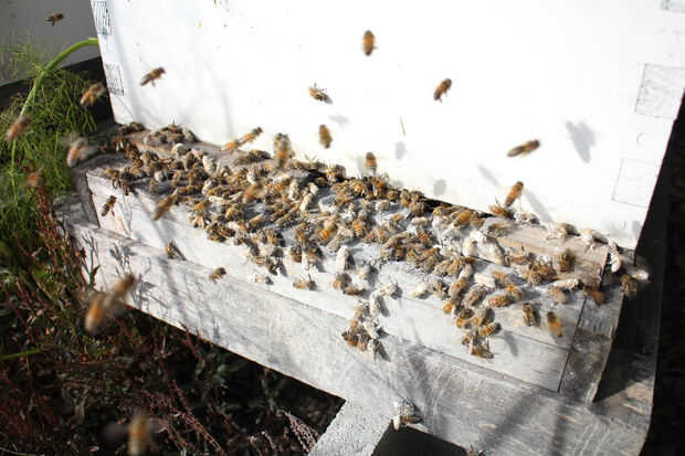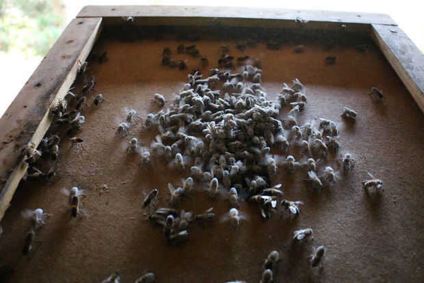 No es miedo, nada como soltar las abejas de un vacío de la abeja. Estas abejas se cubren de azúcar para que no vuele o buzz te agresivamente. De hecho, son bastante vulnerables en este punto. Yo generalmente sacudir las abejas en mi cubierta interna o en la entrada. Escalone y aspecto miserables durante unos 10 minutos mientras que sus hermanas felizmente limpiar apagado el azúcar y calman todo.