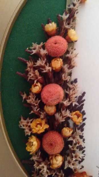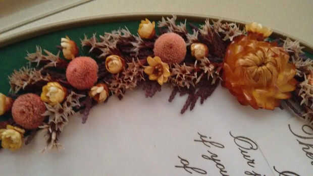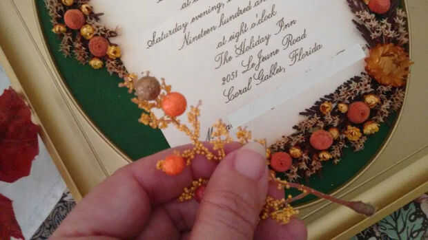 Bastante sencillo: Centro su invitación y usar pegamento o un papel adhesivo para sujetar a la Junta de fieltro. Luego disponer su secado o seda flores en las esquinas de la invitación - o la vuelta... todo lo que crees que se ve mejor. Considerar el espacio que necesitará en su marco, también, mientras se trabaja.