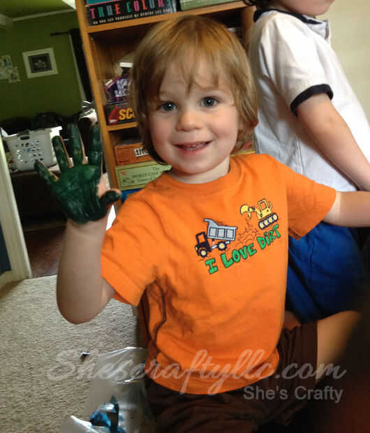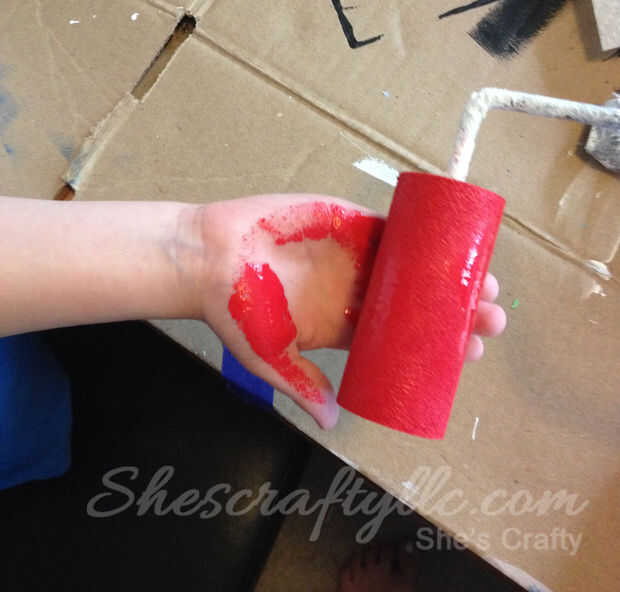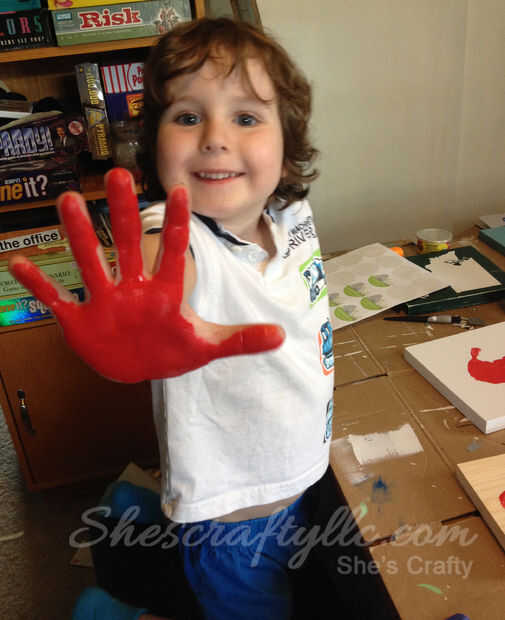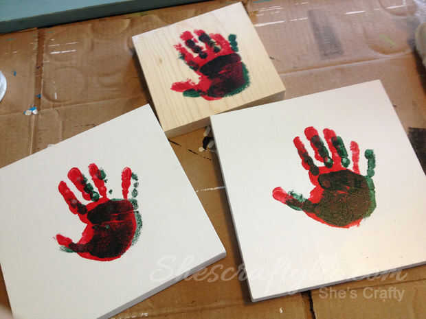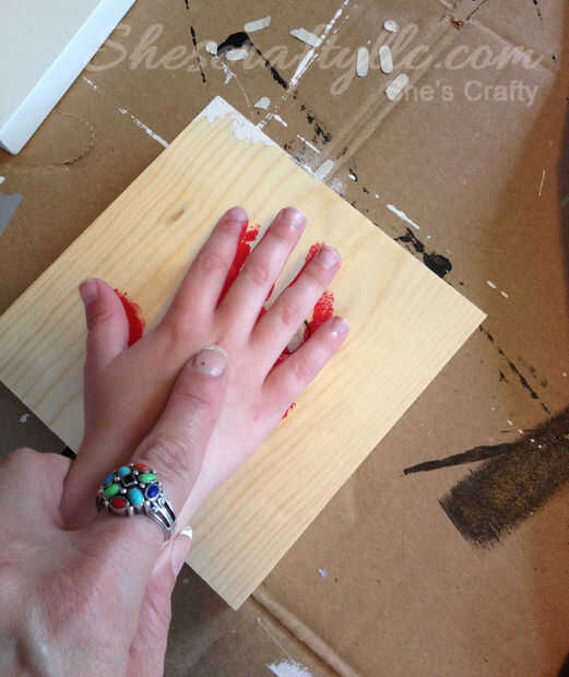 Te desea iniciar con el niño con la mano más grande. Que elegir un color y luego rodillo en (o utilizar una esponja o lo que tengas mano). Entonces hice una impresión de 'test' en una tabla de desecho (un plato de papel trabajaría demasiado) y luego sobre el tablero real. Hice la prueba solo porque mis hijos son jóvenes y quería asegurarse de que ellos sabían cómo funcionaría antes de hacer uno real. Querían tener sus manos pintadas. :-)