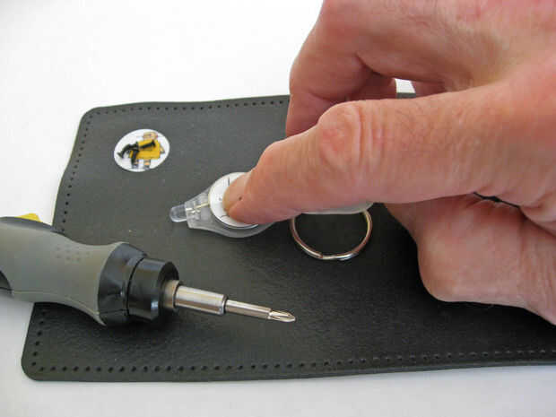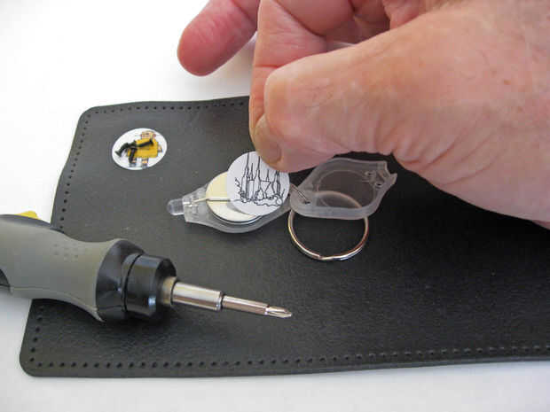 Quite los tornillos, abrir la caja de la linterna y poner en la etiqueta. Pueden orientar la etiqueta de ser la izquierda mano, mano derecha o vertical. Líneas de la red pueden ayudar a alinear la etiqueta. Pulse la etiqueta firmemente sobre el cable de LED a la batería, para evitar desplazamiento. Ponga la cubierta sobre.