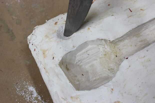 -Tallar un agujero vierta, que tiene forma de embudo de indentación de su objeto hasta el borde del molde de yeso. La apertura debe ser más grande en el borde del molde de yeso y más pequeño líder hasta la muesca del objeto (esto será donde verter el material de fundición en el molde y debe ser suficientemente grande para que el material fluya fácilmente)