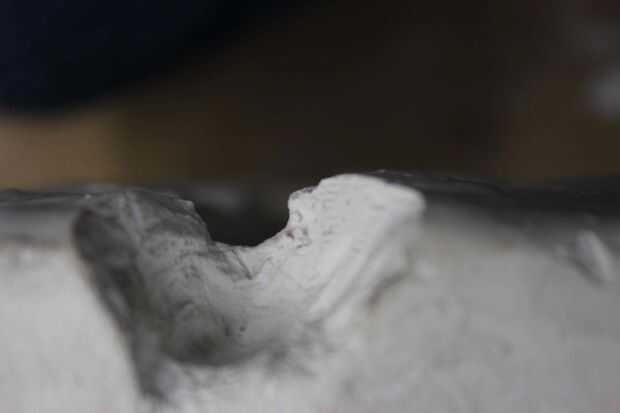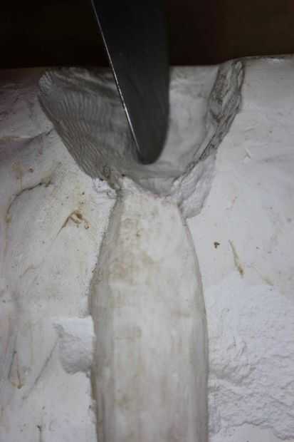 5) tomar un cuchillo o una cuchilla y tallar un cráter circular de yeso mientras es todavía suave (esto se denomina una clave y ayudará a mantener el molde juntos después de la 2ª parte se vierte)