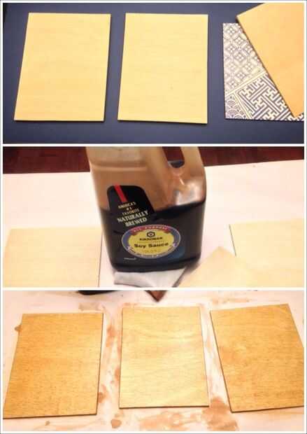 Tuve algunos paneles en mi cubo de chatarra por lo que decidí que ya era suficientemente delgada, que funcionaría para este proyecto. Por lo tanto, los corté a apenas más grande que las áreas de arte que se encuentran en el respaldo de marco para cubrirlos. Con mi botella grande de salsa de soja apliqué una cantidad abundante de salsa a la madera y aplicada con un paño. Apliqué dos capas permitiendo la primera capa se seque al tacto antes de agregar al segundo. Logré la oscuridad quería, obviamente puede continuar como le parezca a lograr su nivel deseado de la coloración.