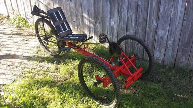 Esto construye un recumbent trike que hice de algunas viejas piezas de la bici y un poco de acero de la caja.
