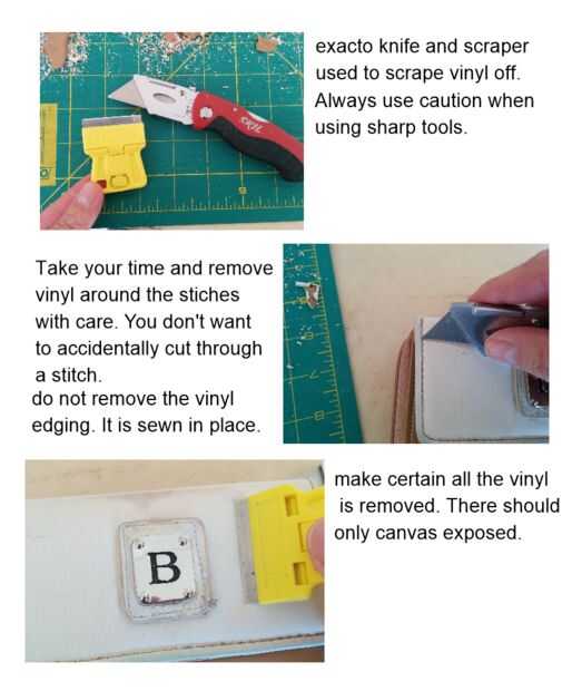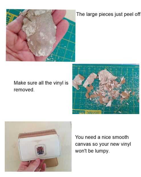 Pela la billetera no es trabajo duro apenas desperdiciador de tiempo. Sólo el cuerpo principal del vinilo se eliminarán. Los bordes exteriores no vale quitar como se cose en el lugar. Sea precavido al raspado cerca de la costura, no desea que la hoja para cortar a través. Los pedazos más grandes de vinilo solo pelada apagado. Los pedazos más pequeños que hay que desguazar apagado. Cuando el vinilo como mina, el pegamento separa el vinilo creando una superficie irregular en la lona a continuación. Es importante raspar todo lo que pega fuera. Necesita una lisa superficie de lo contrario el vinilo nuevo parecerá aterronado.