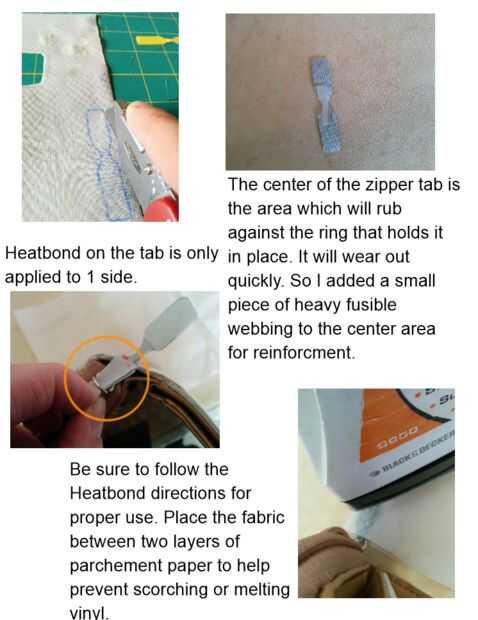 El centro de la ficha cremallera es el área que se frota contra el anillo que sostiene en su lugar. Se desgastará rápidamente. Así que añadí un pedazo pequeño de cinta fusible pesada a la zona centro para refuerzo.