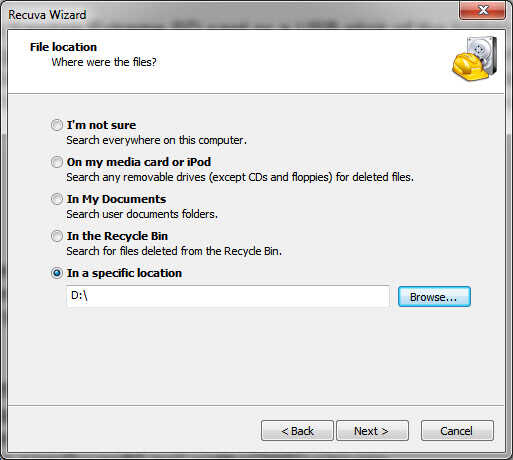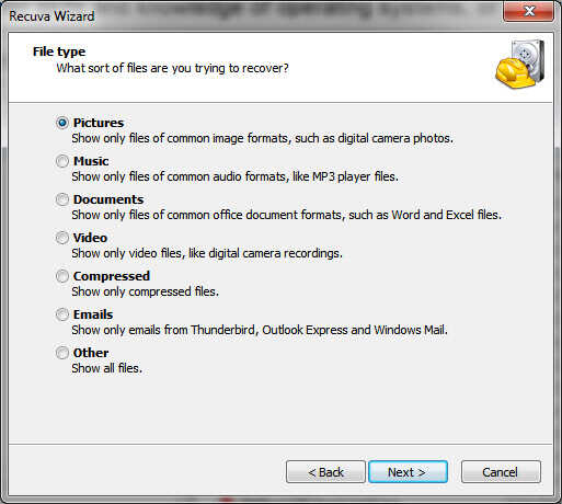 Para mis pruebas copié unas imágenes de mi Instructables en una memoria USB y utiliza la función de eliminar en el explorador de Windows para borrarlos - no mover a la papelera de reciclaje, permanentemente ido... Esto significa que marque la primera casilla así puedo recuperar imágenes. Si usted tiene un tipo diferente de archivo o una mezcla de tipos de archivo, por favor marque "otro". Haga clic en "Siguiente" nos lleva a la selección de la unidad o carpeta donde el donde perdió.