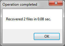 No pude tomar una captura de la búsqueda real como lo hice no doo una exploración profunda y sólo manualmente se eliminaron los archivos. En tu caso realmente puede ver una ventana de progreso de hace bastante tiempo. Como se puede ver en la imagen se encontraron varios archivos, de hecho todo lo que simplemente borré ;) Pero no hay información sobre la estructura de carpetas ni nada se están recuperando. Esto es intencionalmente como el foco del programa es la recuperación de archivos y no para restaurar todo el disco. Ahora puede seleccionar los archivos que desea recuperar y haga clic en "Recuperar". Seleccionar una carpeta en una unidad diferente para los archivos recuperados ser almacenado y si todo es bueno ver un mensaje como este:
