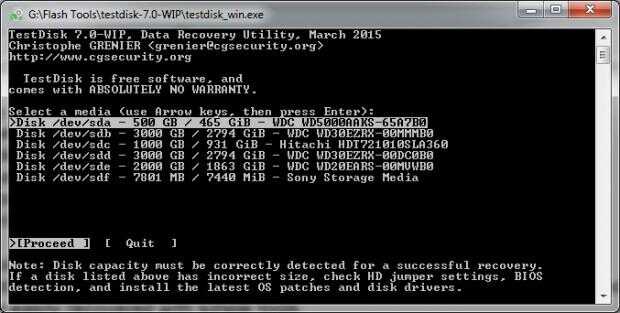 Esta ventana siguiente le permite seleccionar la unidad que desea restaurar, en mi caso mi fiel memoria USB que ya perdieron todo debido a "accidentalmente" todo en ventanas sin guardar mis fotos. Por favor prestar atención aquí como usted no vea las letras de unidad pero sólo qué tipo de coche es! Sin saber (como en un disco duro múltiples de instalación aquí) que seleccione puede significar desaster, así que si en cheque de duda lo que está realmente escrito en el disco duro (si tienes que recuperar uno) antes de seleccionar uno equivocado. De nuevo, utilice las teclas de flecha para seleccionar la unidad y presione "Enter" cuando esté listo.