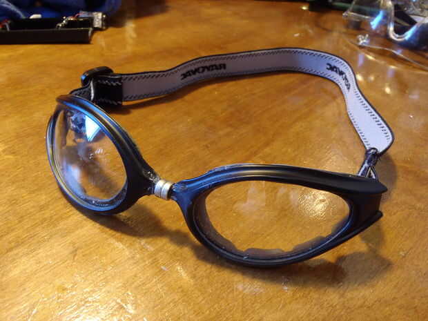 Sin embargo, les repetidamente hacia las gafas de ojos de mi frente finalmente roto por la mitad. Previamente había fijado a uno de los pedazos de oreja rota con un poco de pegamento, pero el mismo método no funciona para reparar el marco roto. Puesto que no había suficiente espacio para la cinta, y soy demasiado cool para que jazz, pegado un par de fuertes imanes permanentes al marco para conectarlos juntos y reemplazar las piezas de la oreja con una correa elástica. Las gafas ahora se ponen a tirar de la correa alrededor de la parte posterior de mi cabeza y llevando la lente dos cerca unos de otros. Los imanes hacen el resto de la obra...