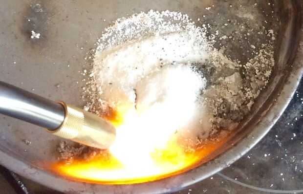 Mover el bórax comienza a disolver con la llama más. Calienta la pila toda al rojo.
