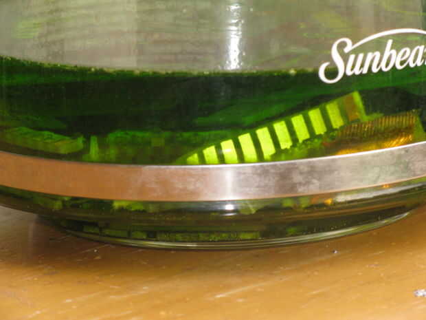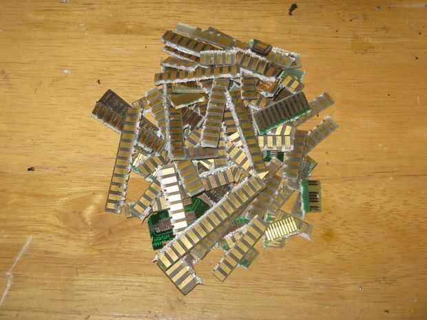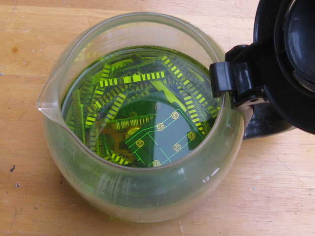 Poner los dedos de oro y limpia circuitos en el pote del café, en otro recipiente mezclar ácido muriático de dos partes y una parte Hidrógeno peróxido y añadir a la jarra de café hasta que sólo cubra los dedos de oro y esperar una semana dándole un revolver diariamente. Ya que tengo una semana que pasará a mis piezas de oro sólido de bajo grado de procesamiento.