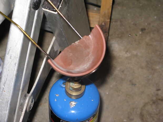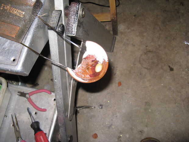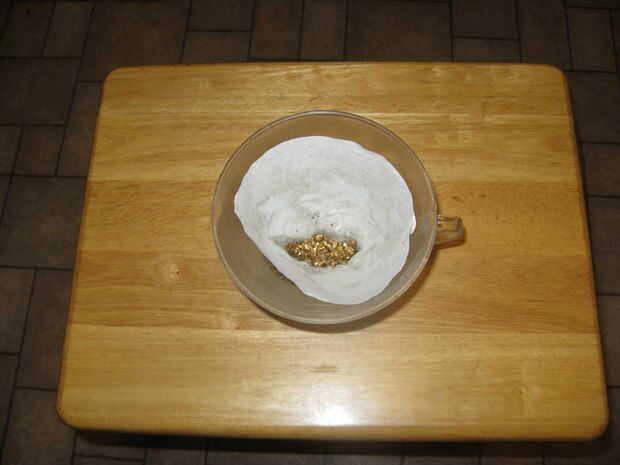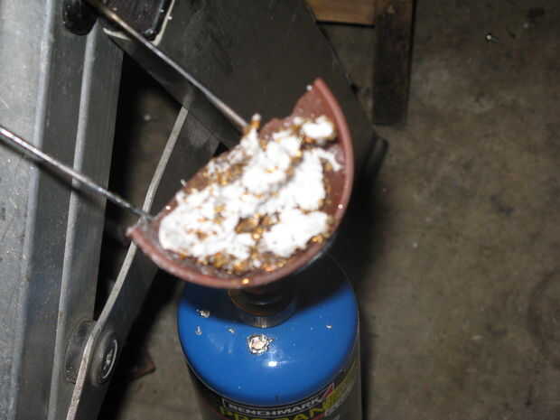 Caliente la taza de arcilla, no te preocupes si el tazón de fuente grietas o fracturas, agregar bórax a la taza caliente, cuando los derretimientos de bórax añadir los copos de oro y más bórax entonces calor hasta un buen grano de oro, deje que se enfríe y pesar para ver cuánto has perdido.