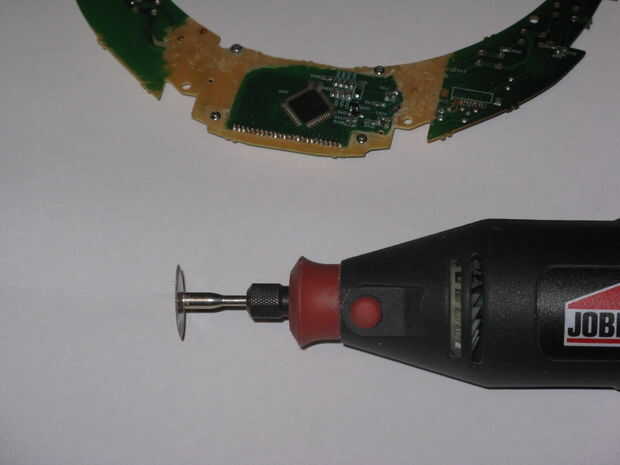 Después de quitar los circuitos no deseados corté el circuito impreso a la forma que quiera con mi dremel dejando una pestaña para el montaje de la pantalla LCD.