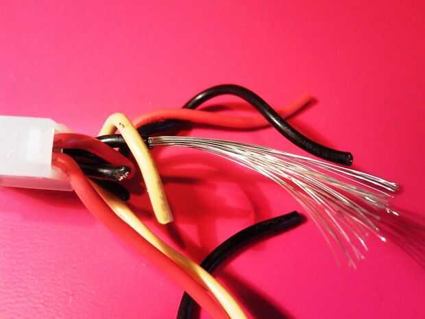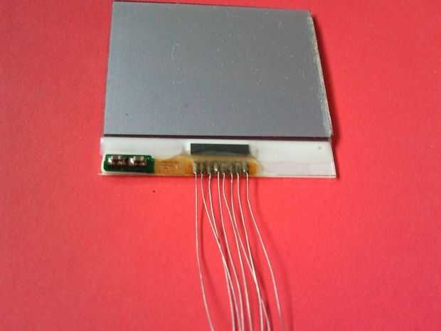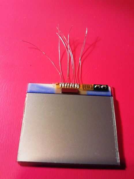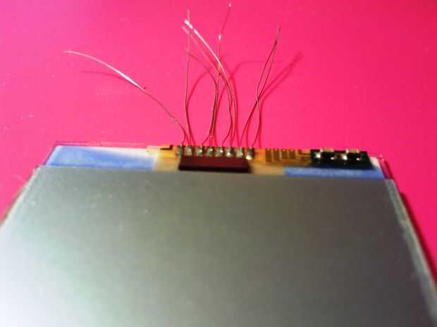 Ahora la pantalla debe estar preparada para montaje en tablero de algunos. Para ello los cables deben soldarse a los ocho pads de contacto metal. Tomé muy diminutos cables de extracción del cable de múltiples hilos pelado. Después de la soldadura me fijo el alambre de soldadura de puntos con pegamento epoxi.