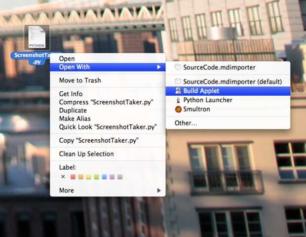 Una vez que has terminado de editar el script en python guardarla y cerrarla xcode. En su escritorio, adecuado control o haga clic en haga clic en el script (ScreenshotTaker.py) y debajo de "abrir con >" elegir «Construir Applet». Una aplicación llamada ScreenshotTaker debe aparecer en el próximo par de segundos en el escritorio. Esta es la aplicación final que vamos a tener lanzamiento en el arranque.