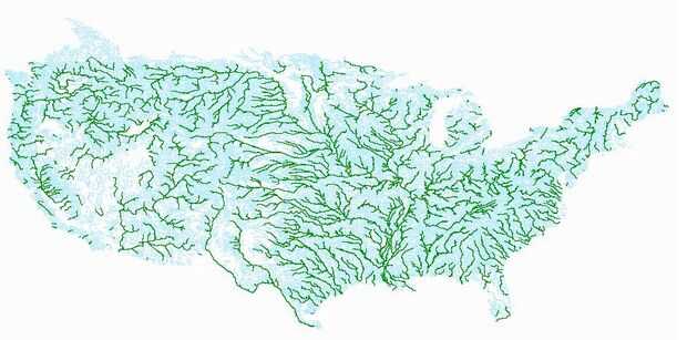 En la imagen verás el río mapa de los Estados Unidos y como nuestra red eléctrica hay muchos medios para agua viajar. El truco es encontrar lugares estratégicos para la instalación de bombas, esclusas o estaciones para mover el agua de pequeños arroyos a los ríos más grandes y transmitir el agua como la red eléctrica. Georgia por ejemplo n ponemos 200 MW de electricidad de la red y en California toman 200 MW fuera de la red. La red tiene una líneas de transmisión establecidas y el pensamiento fue que podríamos utilizar nuestro sistema de agua existente para lograr lo mismo.