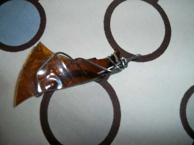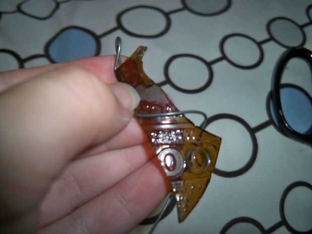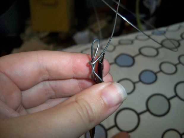 Tomar el alambre y hacer un lazo con él. Este lazo va a ser lo que tu colgante cuelga, así que no lo hacen demasiado grande. Tome esto y colocarlo en la parte superior de la pieza de vidrio. (el lado que quieras que cuelgue de) Luego Envuelva el cable alrededor de su copa un par de veces, envuélvalo en diferentes direcciones para asegurar la estabilidad. Tome el extremo de su hilo y enróllelo aroung su circuito dos veces, parte posteriora alrededor de su cristal y alrededor de su ciclo otra vez. Cortar ningún cable extra y meta final en uno de los lazos en la parte posterior de su cristal.