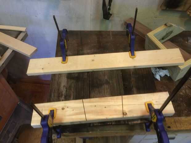 Una vez que tengas la madera pegada arriba Asegúrese de abrazadera sobre la madera contrachapada para secar - usar otro para difundir la presión de las pinzas. Los tableros serán probablemente crujen y potencialmente crack, pero el pegamento debe tener lo que se fija y le dará una superficie más plana para los estantes.