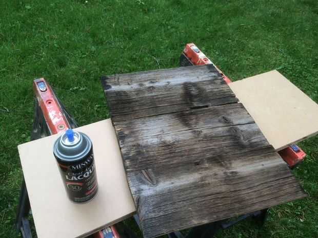 Después de eso debe rociar unas cuantas capas de barniz sobre los tableros recuperados para empezar a recibir una buena, consistente, capa en él y fijar cualquiera de las otras piezas sueltas. Yo uso laca de spray de Minwax porque usted puede dirigir el spray mucho mejor que algunos otros tipos y no grupo cuando sale. (rociar este al aire libre - Nunca rocíe laca dentro!!!! Adenda - dude en aerosol dentro de if le tenga una ventilación adecuada y una máscara.). Me gusta usar una laca de brillo porque quiero que hacer un ligero brillo, pero satinado o semi-brillante.