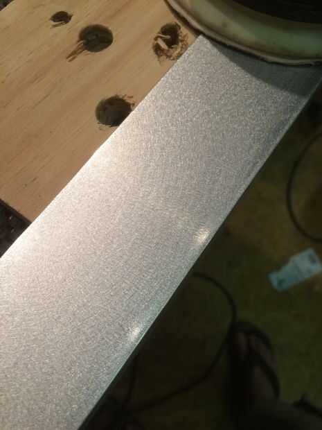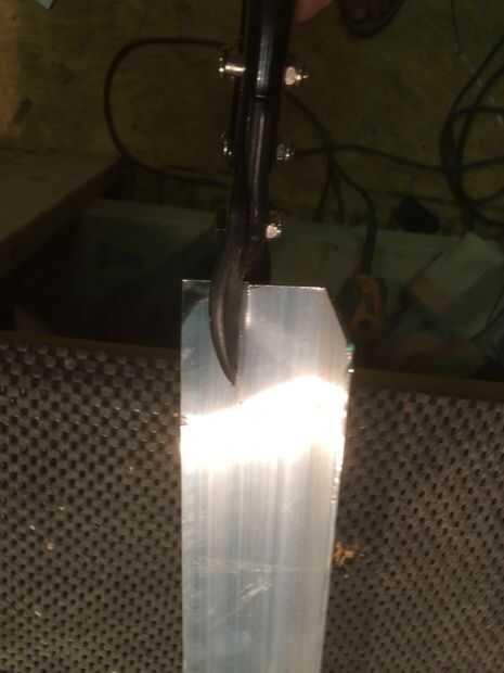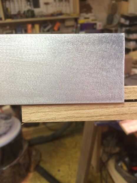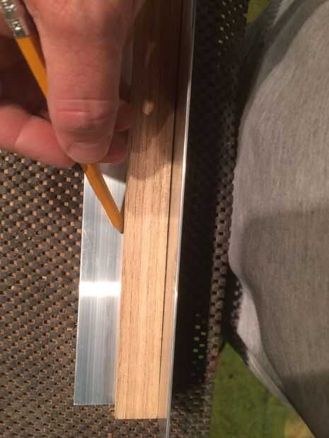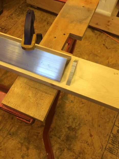 Hay 3 estantes, cada uno con una pieza de aluminio que es 2" a cada lado. Usé un pedazo en ángulo de aluminio que compré de HD. Cortar en secciones eran cada 14,25" durante mucho tiempo con mi sierra de sable, pero funciona igual de bien un serrucho para corte de metales. He utilizado la primera pieza que cortar como la plantilla para el próximo 2 y después terminé puse los 3 juntos para asegurarse de que estaban incluso. Utilicé mi lijadora excentrica, y lija de grano 150, para aplanar los extremos, suavizar las partes ásperas y algunos detalles en el lado será la parte delantera. Dos de los estantes (los 2 pulgadas anchas) tendrá que tener la delantera corta por 1". Utilicé unas tijeras para chapa, pero no fue un proceso fácil.