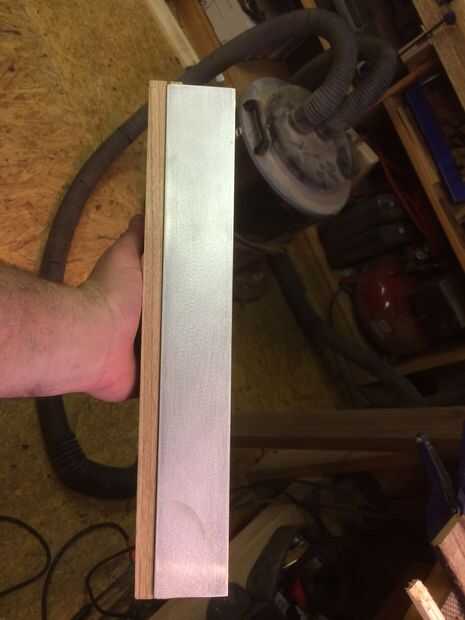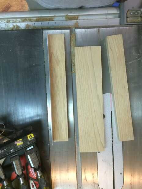 Parte fácil - usé mi sierra de mesa para cortar un surco para el metal de los estantes para adaptarse a. En los estantes más delgados es una pulgada de profundidad y corre a lo largo de la Junta. El estante más grueso tiene la ranura de corte a 2 pulgadas (y usted no tiene que recortar al ancho del aluminio). Una vez que lo hecho puede insertar los estantes de aluminio en las ranuras y rocíe los estantes con laca (otra vez... fuera!!!!).