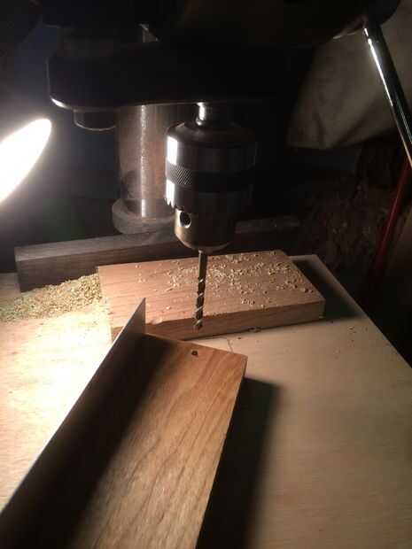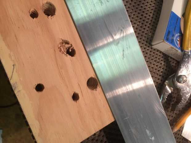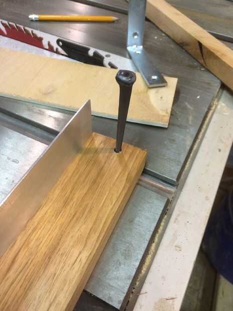 OPCIONAL!! La laca de rociadura - añadí clavos especiales a los lados para evitar que las botellas de especias cayendo a los lados. Las uñas de especialidad son difíciles de conseguir, así que creo que la mejor opción es tomar 1/4 clavijas de madera de la historia grande de la caja de su elección - a 2 pulgadas de longitud. Usando una broca es clasificada para metal y madera (la mayoría de ellos son) profundizar en el estante de 1/2" en los extremos y 1 pulgada de la parte posterior de los estantes más pequeños y 2 pulgadas de la parte posterior en el más grande. La broca debe ir a través de la madera y el metal. Utilicé una prensa del taladro, pero funciona un taladro de mano-simplemente mantenerla vertical (puede utilizar 2 placas juntas en forma de V y que utilice como guía). Limpiar el orificio y meter los tacos de corte en el agujero. Esto fijar el aluminio en su lugar y evitar especias de caerse a los lados cuando usted toma hacia fuera de otros.