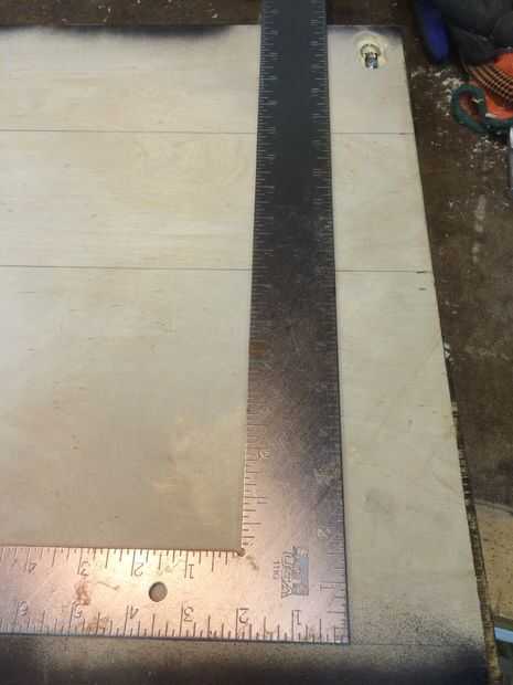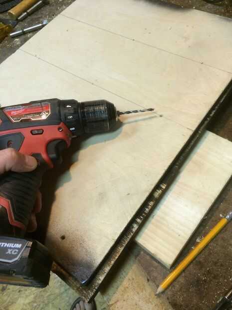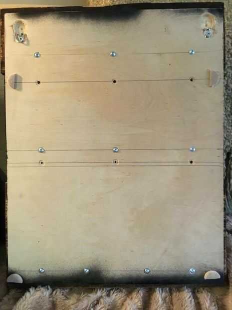En la parte posterior de la madera contrachapada, con las placas recicladas Unido, dibuje líneas rectas a partir en 1 pulgada de la parte inferior, 6 pulgadas hasta de aquél y otros 6 de que una. Perfore agujeros a lo largo de esas líneas - utilicé 3 agujeros por pequeño estante y 4 para el estante más grande, pero eres Bienvenido a utilizar más si lo que te hace feliz (tenga en cuenta la presencia de un juego de líneas - eran mi primer intento y no permitía suficiente espacio para las botellas de especias). También, en este punto Asegúrese de que usted decide cómo se cuelgue el estante. Solía D-suspensiones y un poco de forestner para cortar espacio para los tornillos en la pared para sostener los soportes de suspensión.