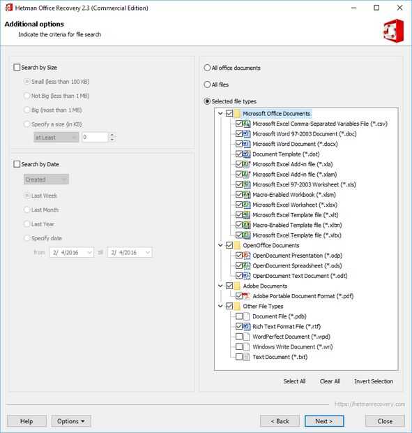 Si necesita restaurar un archivo específico o grupo de archivos, puede configurar el tamaño, fecha de creación o edición o tipo de archivo para evitar la necesidad de buscar los archivos necesarios.