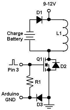 Las funciones de este circuito es un pulso de onda cuadrada generado por el Arduino se amplificaron con un MOSFET para cambiar un inductor (L1) encendido y apagado rápidamente. Cada vez el poder para el inductor (L1) se apaga el campo magnético que rodea la bobina colapsa que genera un pico de alto voltaje. Orientamos este punto en la batería de carga a través de D1 que permite corriente fluya en solamente una dirección. D2 es una medida de seguridad para ayudar a proteger el MOSFET se dañe por los picos de alto voltaje. D3 es un diodo de bloqueo para mantener la tensión de alimentación de acoplamiento con la fuente de Arduino. R1 es un pull-down resistor para mantener el MOSFET hasta que recibe un pulso positivo en la puerta.